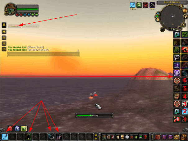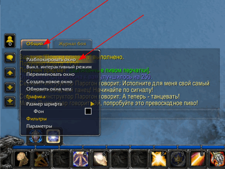 5) Изменить вид от первого лица приблизив камеру (клавиша Home на клавиатуре или вращать колесико мышки пока не появится вид от первого лица) 6) Удерживая правую кнопку мыши и двигая указатель мыши вверх или вниз отрегулировать вид так, чтобы линия горизонта находилась на уровне верха 6-й кнопки вертикальной панели спелов. 7) Вынести на нижнюю панель спелов спел рыбалки (из книги навыков), наживку (из сумки) - если будете использовать наживку, Дополнительную способность (например, способность Path of Frost рыцаря смерти или просто Elixir of Water Walikng) - если будете использовать. 8) Переместите окно чата за пределы воды вверх: наводим мышку на окно чата и держим, пока окно чата не активируется и в его верхней части не появятся 2 закладки – "Общие" и "Журнал боя". Наводим указатель мыши на закладку "Общие"и щелкаем правой кнопкой мыши. В Выпавшем списке щелкаем по "Разблокировать окно":